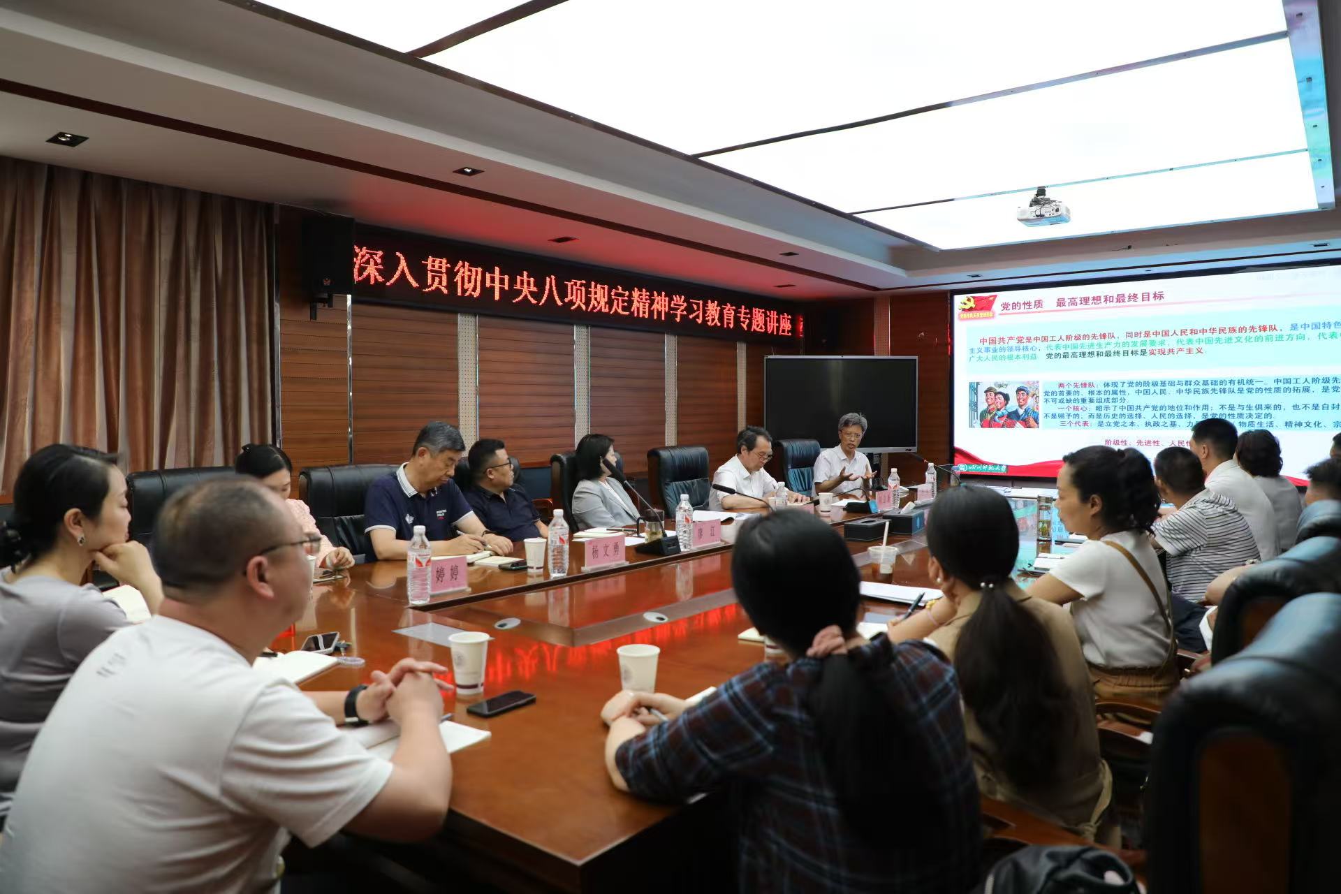 为进一步深化全面从严治党,推动中央八项规定精神落地见效,根据学校深入贯彻中央八项规定精神学习教育工作安排,2025年5月8日下午,学校在绵阳校区行政楼一楼会议室举办深入贯彻中央八项规定精神学习教育专题讲座。讲座由四川师范大学教育发展集团有限公司党委副书记、纪委书记李华主讲,学校党委书记、省政府督导专员左冬梅,党委副书记、纪委书记刘立新以及其他党委委员、纪委委员,各校区党工委书记及各二级党组织正副书记、专职组织员,党委职能部门工作人员及校团委书记等参加讲座。讲座由党委副书记廖江主持。