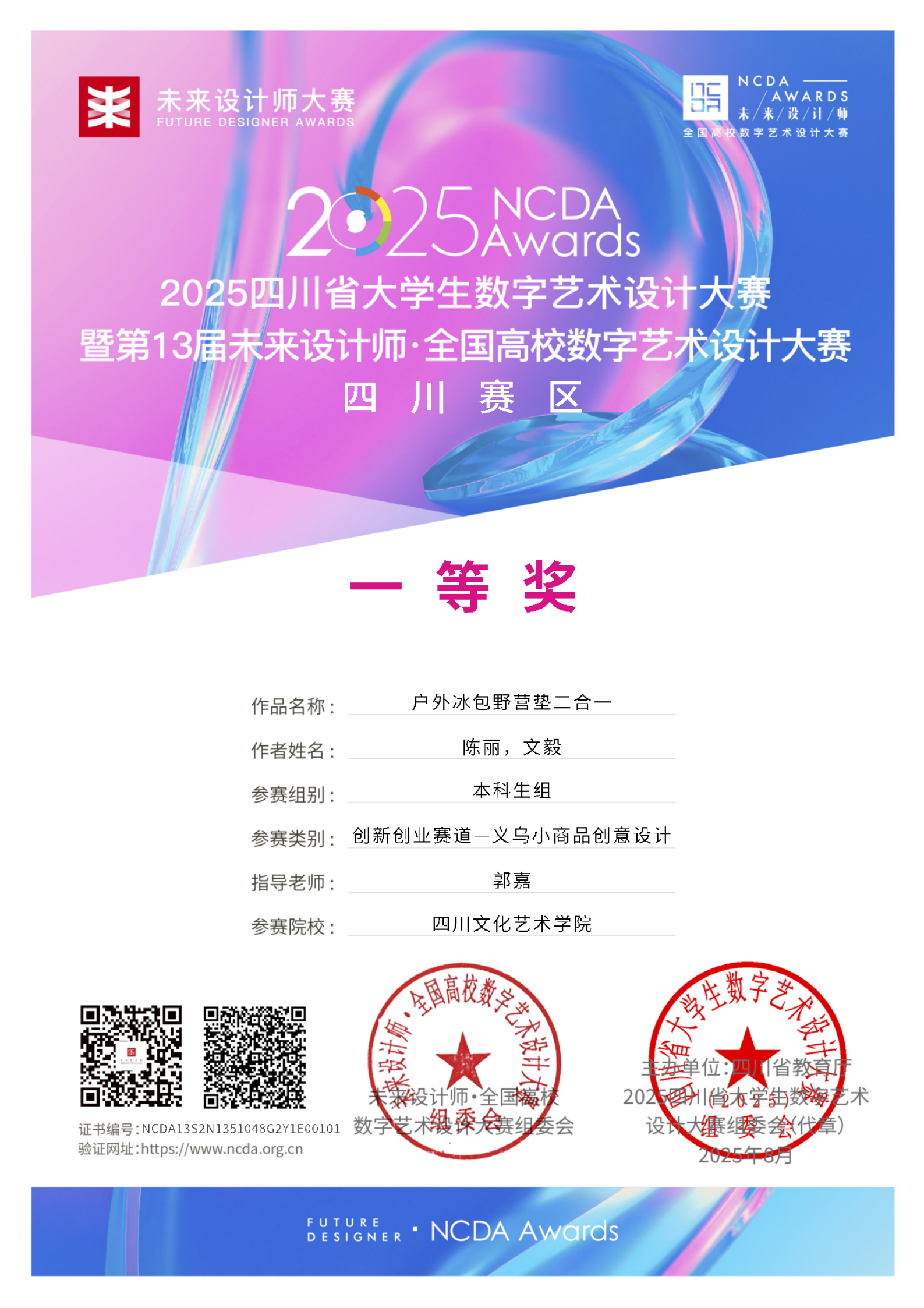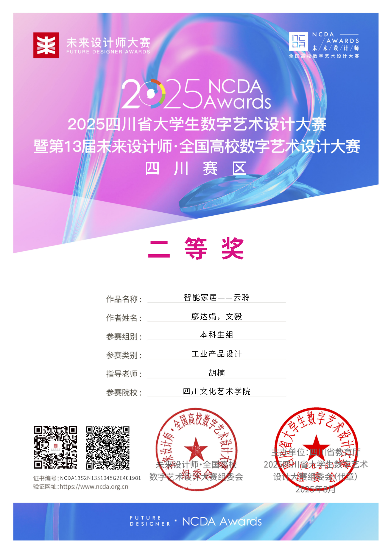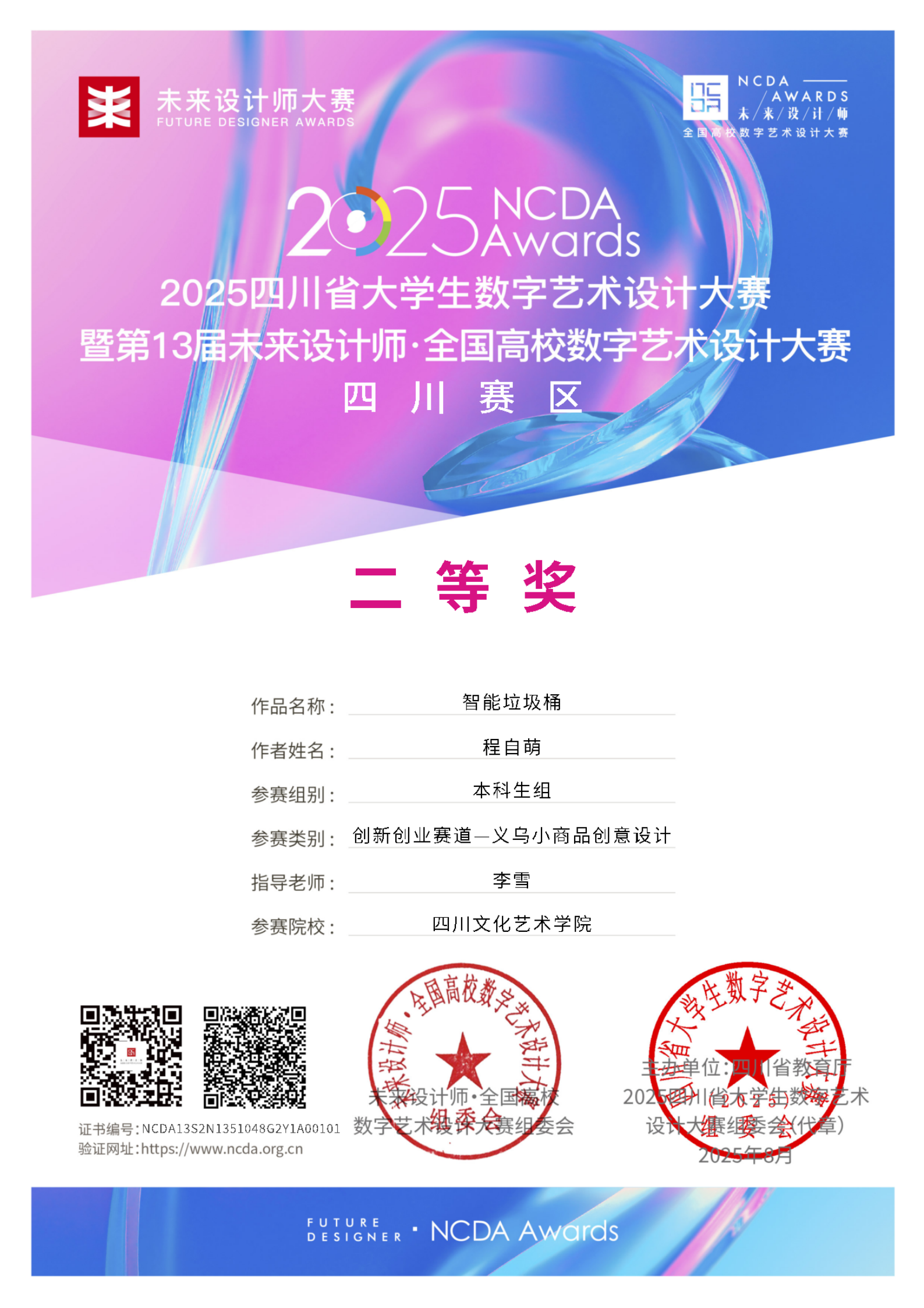 近日,2025年第13届未来设计师·全国高校数字艺术设计大赛(NCDA)获奖名单正式公布。我校数智设计学院产品设计专业学生凭借创新的设计理念与扎实的专业实践能力,在全国赛及省赛中屡创佳绩,共荣获全国总决赛一等奖1项,省级一等奖4项、二等奖4项、三等奖9项。同时,我校获评四川赛区优秀组织奖,蔡文宇老师获评省级优秀组织教师奖,郭嘉老师荣获国赛优秀指导教师奖,胡楠、郭嘉、李雪、蔡文宇四位老师均荣获省级优秀指导教师称号。