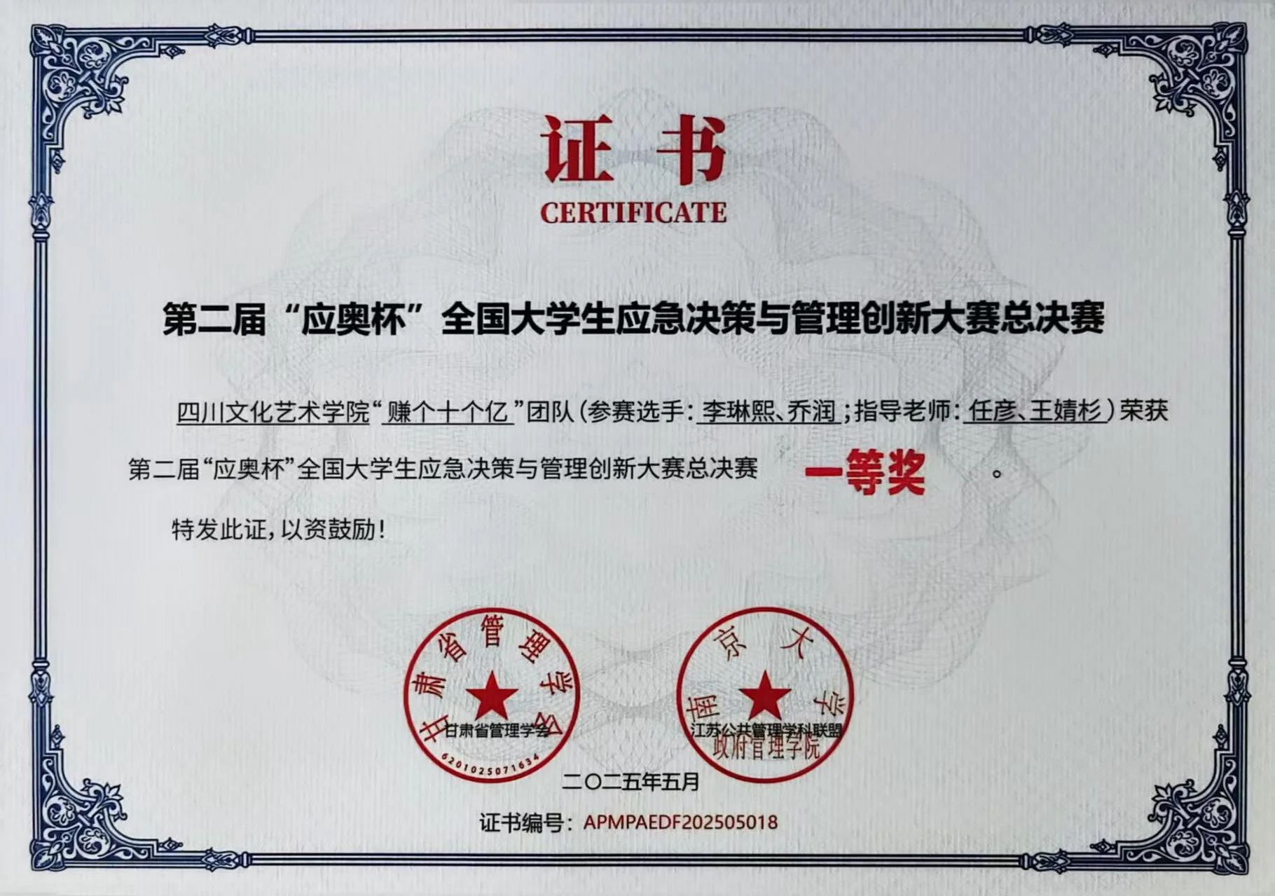 本次在第二届“应奥杯”全国大学生应急决策与管理创新大赛中取得的优异成绩,不仅是对学校经济管理学院学子专业能力和综合素质的肯定,也为学校的学科建设和人才培养提供了有力的支撑。未来,学校将继续秉持创新发展的理念,培养更多具有创新精神和实践能力的高素质人才,为学校高质量发展提供有力支撑!