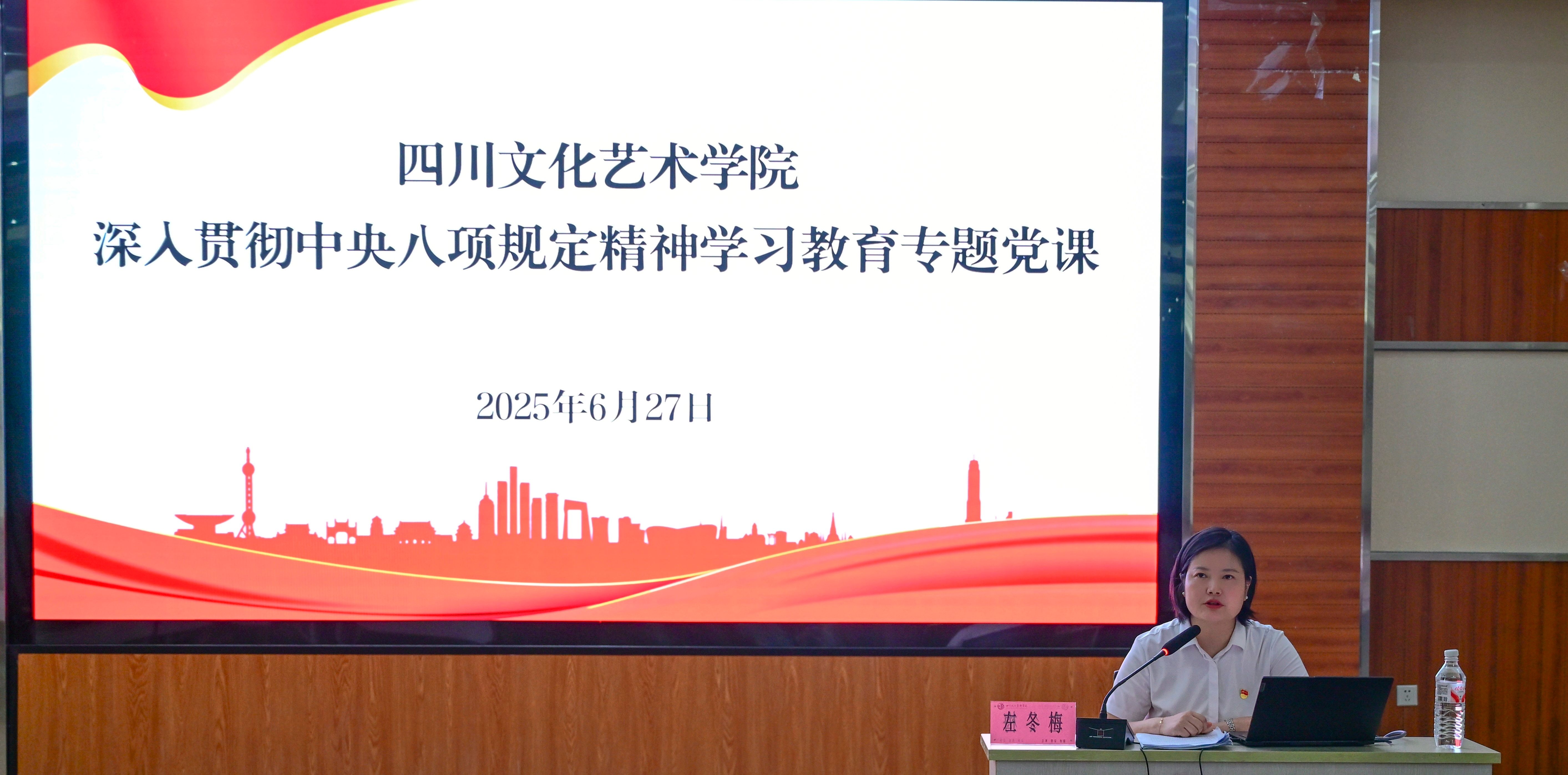 6月27日下午,学校党委书记、省政府督导专员左冬梅以《弘扬优良作风,筑牢育人根基--深入贯彻中央八项规定精神学习教育》为题讲授专题党课。学校党委委员、纪委委员,校区党工委书记,各党总支及党支部书记、副书记、专职组织员,校团委书记,各二级党组织师生党员代表等参加。党课由党委副书记廖江主持。