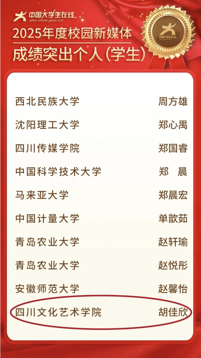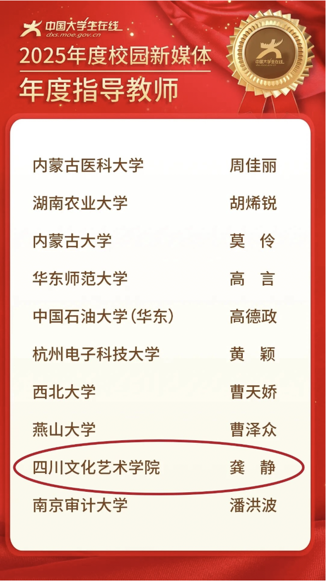 近日,教育部中国大学生在线公布2025年度校园新媒体表彰名单,四川文化艺术学院再次脱颖而出,荣获"校园新媒体融合共建40强",龚静老师连续五年获评"校园新媒体优秀指导教师"(为唯一获奖的民办高校教师),新媒体中心学生团队微信部胡佳欣荣获"2025年度校园新媒体优秀学生编辑"。这是我校连续五年获得此项国家级表彰,标志着学校在网络思想政治教育、校园文化传播及学生实践能力培养方面取得的扎实成效与持续突破。