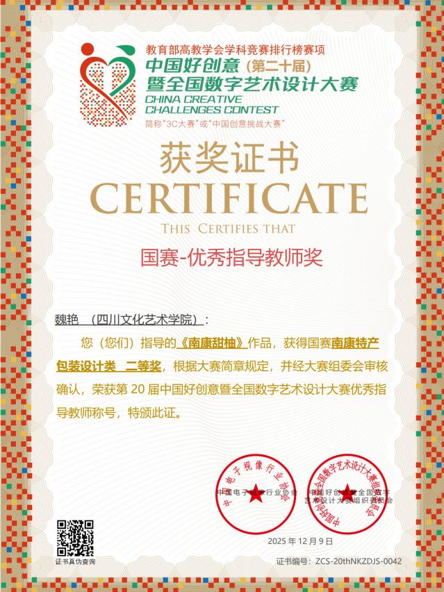 近日,在第20届中国好创意设计大赛国赛的南康跨境电商家具设计专项赛中,我校数智设计学院视觉传达设计专业师生凭借出色的创意与扎实的专业技能,脱颖而出,取得优异成绩。在“南康特产包装设计”赛道中,数智设计学院2022级视觉传达设计本科2班学生刘丽,凭借其作品《南康甜柚》荣获全国总决赛二等奖。该作品围绕南康本土特色产品进行包装创意设计,充分展现了南康特产的独特魅力,有效提升了本土特产的品牌价值与市场吸引力。同时,指导教师魏艳荣获“优秀指导教师”称号。