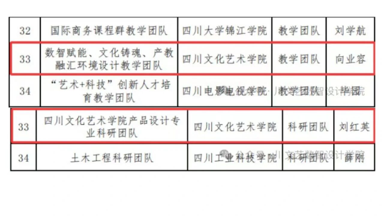 公示结果显示,此次获批的两个项目分别为刘红英副教授牵头主持的《四川文化艺术学院产品设计专业科研团队》与向业容副教授牵头主持的《数智赋能、文化铸魂、产教融汇环境设计教学团队》。两个项目都聚焦专业建设核心领域,紧密契合专业发展趋势与文化传承创新使命,具有较强科研创新价值与教学实践指导意义。