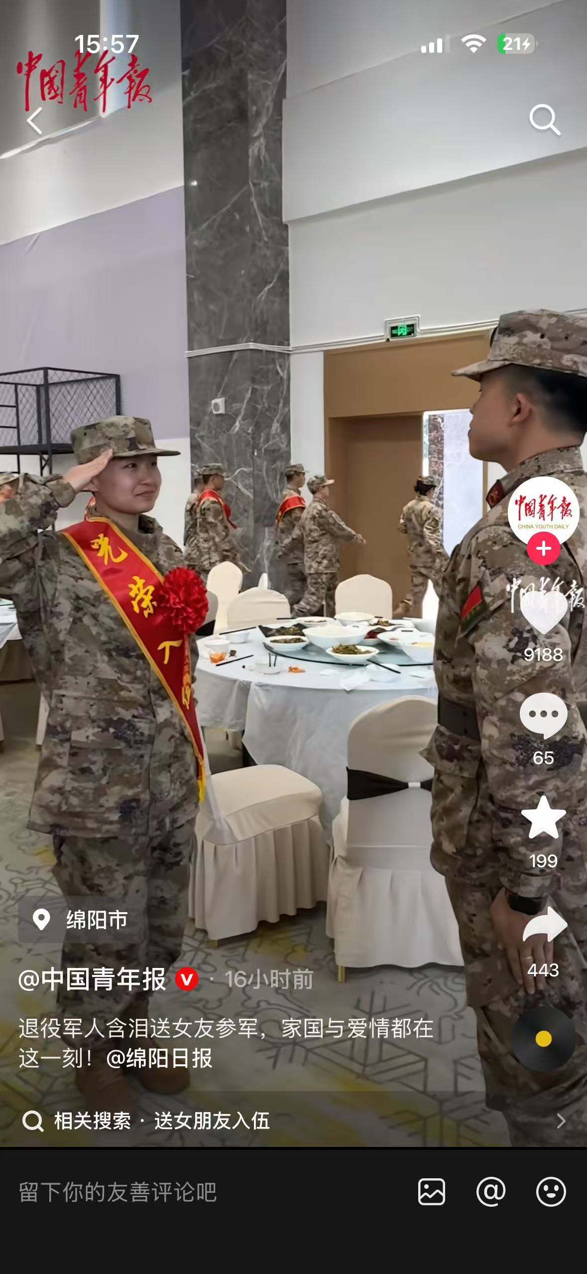 退役军人含泪送女友参军,家国与爱情都在这一刻!@绵阳日报 - 抖音