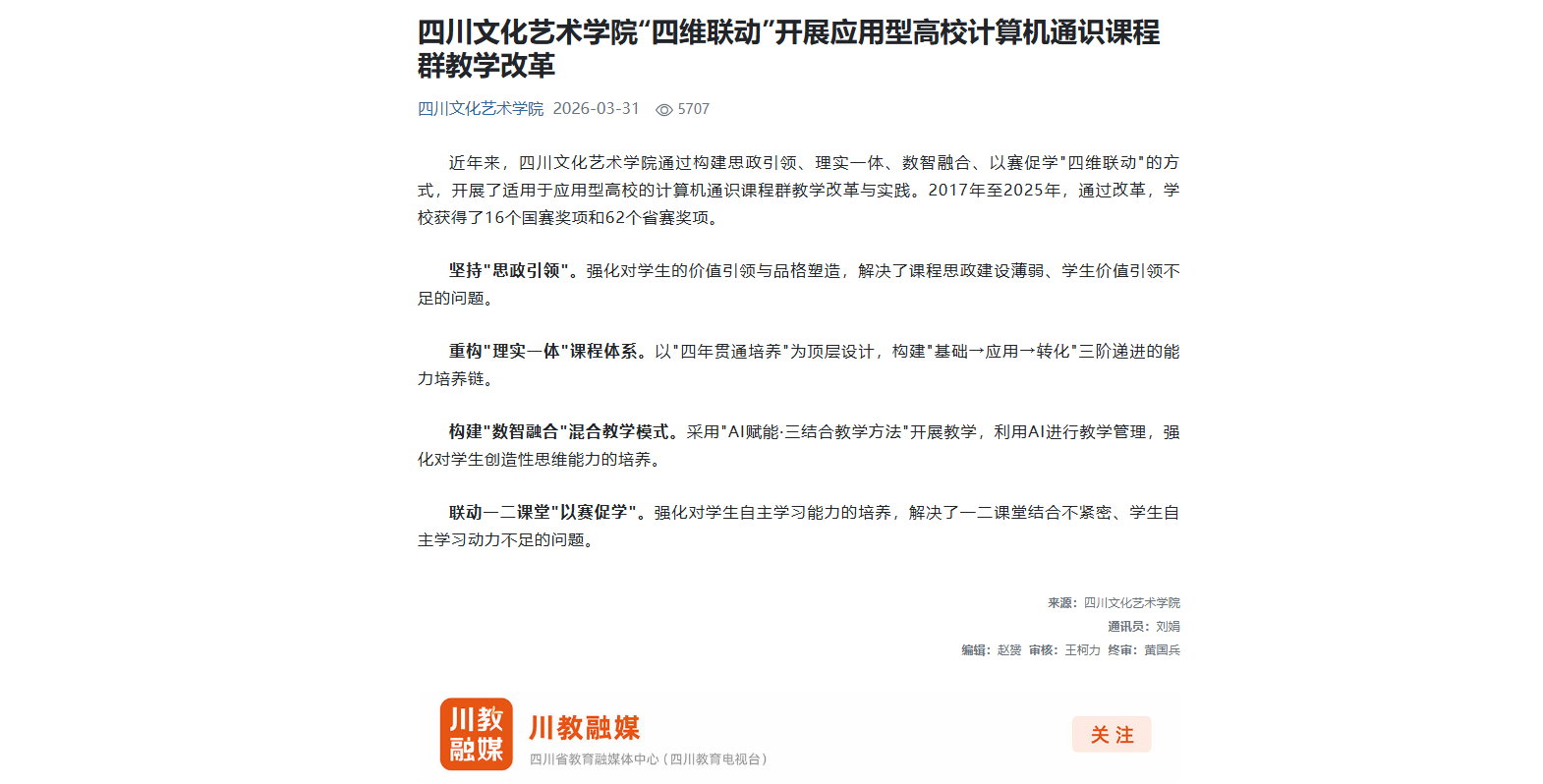四川文化艺术学院应用型高校计算机通识课程群“四维联动”教学改革成果