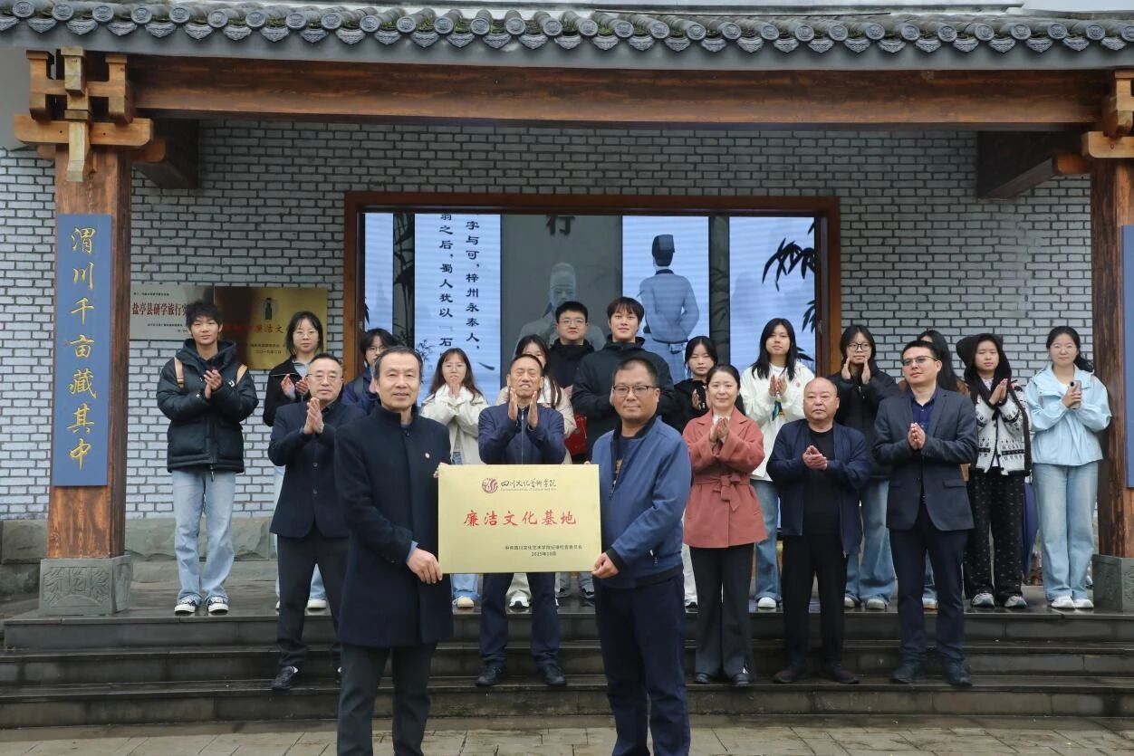 廉洁文化是中华民族传承千年的精神瑰宝,为涵养风清气正的社会风尚、弘扬崇廉尚洁的价值理念提供了坚实支撑。2025年10月24日,四川文化艺术学院党委副书记、纪委书记刘立新,绵阳校区党工委书记何全杰,纪委委员兼党政工作部副部长张璇,文化旅游学院党总支书记梁莉带领学生代表赴绵阳市盐亭县文同清风馆,隆重举行"廉洁文化建设基地"揭牌仪式。盐亭县文化广播电视和旅游局副局长任文韬,丝路源文化旅游发展有限公司经理杨桂伟,学校西部写生基地副主任范福勇、办公室主任郑理出席活动。仪式由梁莉主持。