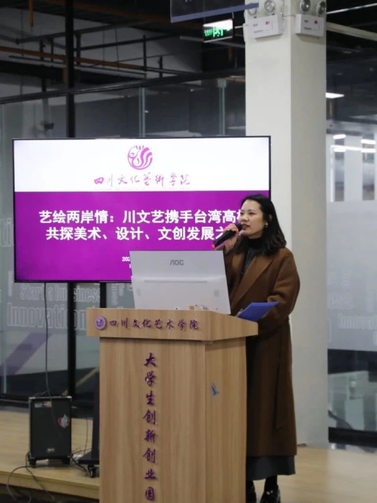 参观结束后,交流座谈会以“艺绘两岸情:川文艺携手台湾高校共探美术、设计、文创发展之路”为主题,于大学生创业园2楼正式拉开帷幕。由我校国际交流学院院长钟欣纯致辞表达了对台湾师生的热烈欢迎,并介绍了学校的发展历程、办学理念以及在文化艺术教育方面的成就。她强调,此次交流活动旨在通过艺术的力量,架起两岸沟通的桥梁,推动两岸文化艺术的交流与融合。成都浓园·四川省对台交流基地办公室的谢柏园顾问出席此次活动,详细介绍了来访的台湾院校师生在文化艺术设计方面的发展和取得的成绩,并对我校的接待安排表示感谢。
