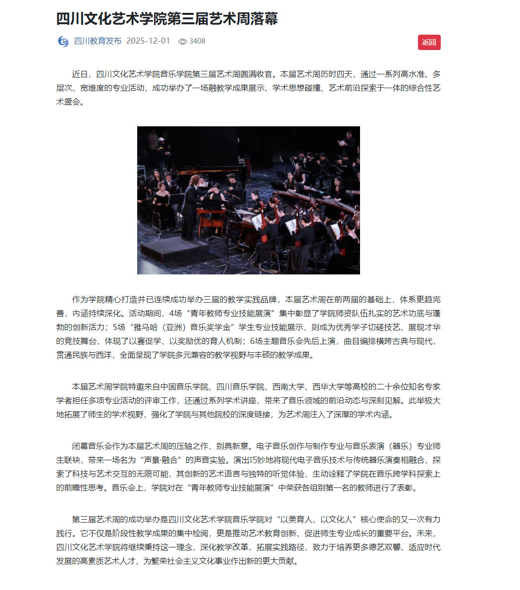 深化美育实践 奏响育人华章——四川文化艺术学院第三届艺术周圆满落幕 —四川站—中国教育在线 (eol.cn)