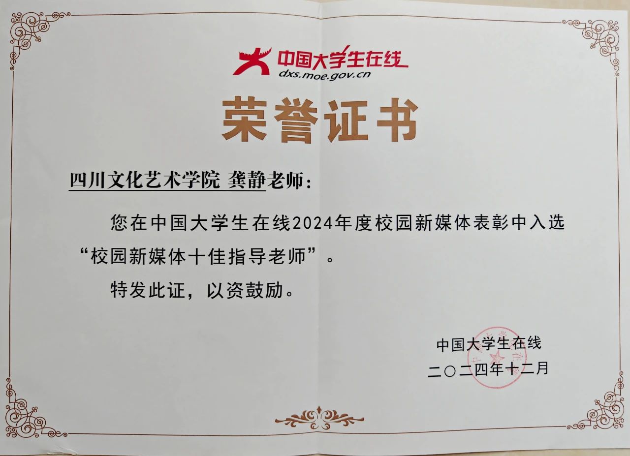 7月14日,由教育部思想政治工作司指导的全国大学生网络文化节引擎高校领航行动暨网络育人队伍建设研讨会在南京师范大学举行。四川文化艺术学院作为全国民办高校代表受邀参会,并凭借近年来在网络育人领域创新实践和突出成果,荣获“2024年度校园新媒体融合共建40强”“2024年度校园新媒体联合培养突出贡献奖”双项国家级荣誉,是全国唯一获奖的民办高校。学校大数据部部长、党委宣传部副部长、新媒体中心主任龚静老师获评“2024年度校园新媒体十佳指导教师”。