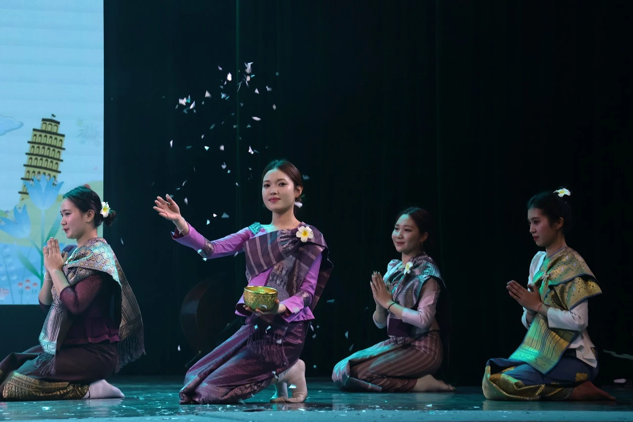 随后,晚会正式拉开帷幕。各国学生代表身着国家特色的民族文化服装相继登场,通过舞蹈、歌曲、交响乐在内的多样化表演,展现了各个国家文化礼仪及积极向上的精神风貌,向观众展示了文化融合的美好图景。全场座无虚席,师生们沉浸其中。现场成为一场跨越文化与地域的视听盛宴,展现了多元文化的和谐共鸣。随着传统中国经典舞蹈《映山红》的精彩呈现,本次国际文化艺术节圆满闭幕。