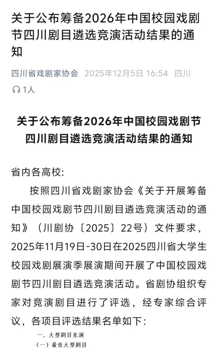 2025年11月30日,2025年中国校园戏剧节四川省大学生校园戏剧展演圆满落幕。本次活动由四川省文学艺术界联合会、四川省教育厅、四川省文化和旅游厅共同主办,旨在为高校戏剧爱好者搭建展示才华的舞台,推动校园戏剧事业蓬勃发展,引导广大青年坚定理想信念、书写奋斗青春。