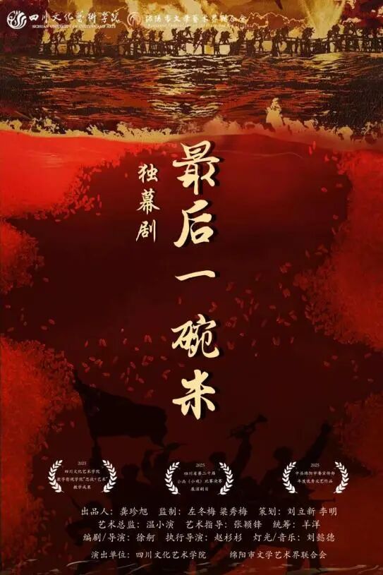 原创作品《最后一碗米》由专业教师徐舸、赵杉杉、刘懿德三位老师共同指导,表演专业学生主演。作品以时空交错的叙事方式,将跨越八十余年的红色记忆徐徐展开。青年秦建国陪伴患有阿尔茨海默病的老红军秦风山走进千佛山战役纪念馆,“最后一碗米”成为揭开千佛山阻击战精神密码的钥匙。1935年千佛山阻击战,弹尽粮绝的红军战士死守阵地73天,运粮队长老秦,将家中仅存口粮送上战场,用“最后一碗米做军粮”的赤诚,书写了军民鱼水情的壮阔史诗。剧中“山娃子”奔赴火线、小海壮烈牺牲等情节深深打动现场观众,完成了与红色基因的血脉衔接,实现了一场跨越世纪的精神对话。作品最终荣获“优秀剧目”。