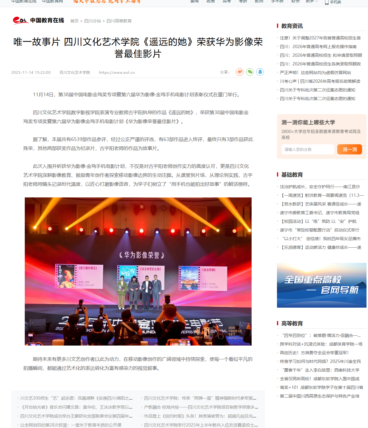 唯一故事片 四川文化艺术学院《遥远的她》荣获华为影像荣誉最佳影片 —四川站—中国教育在线