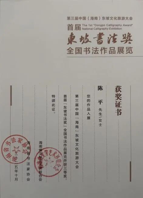 近日,由海南省文学艺术界联合会、澄迈县人民政府联合主办,海南省书法家协会承办的首届 “东坡书法奖” 全国书法作品展览在福山美术馆隆重开幕。我校美术学院陈平副教授凭借其深厚的书法功底和对东坡精神的深刻理解,在众多参赛者中脱颖而出,荣获三等奖。