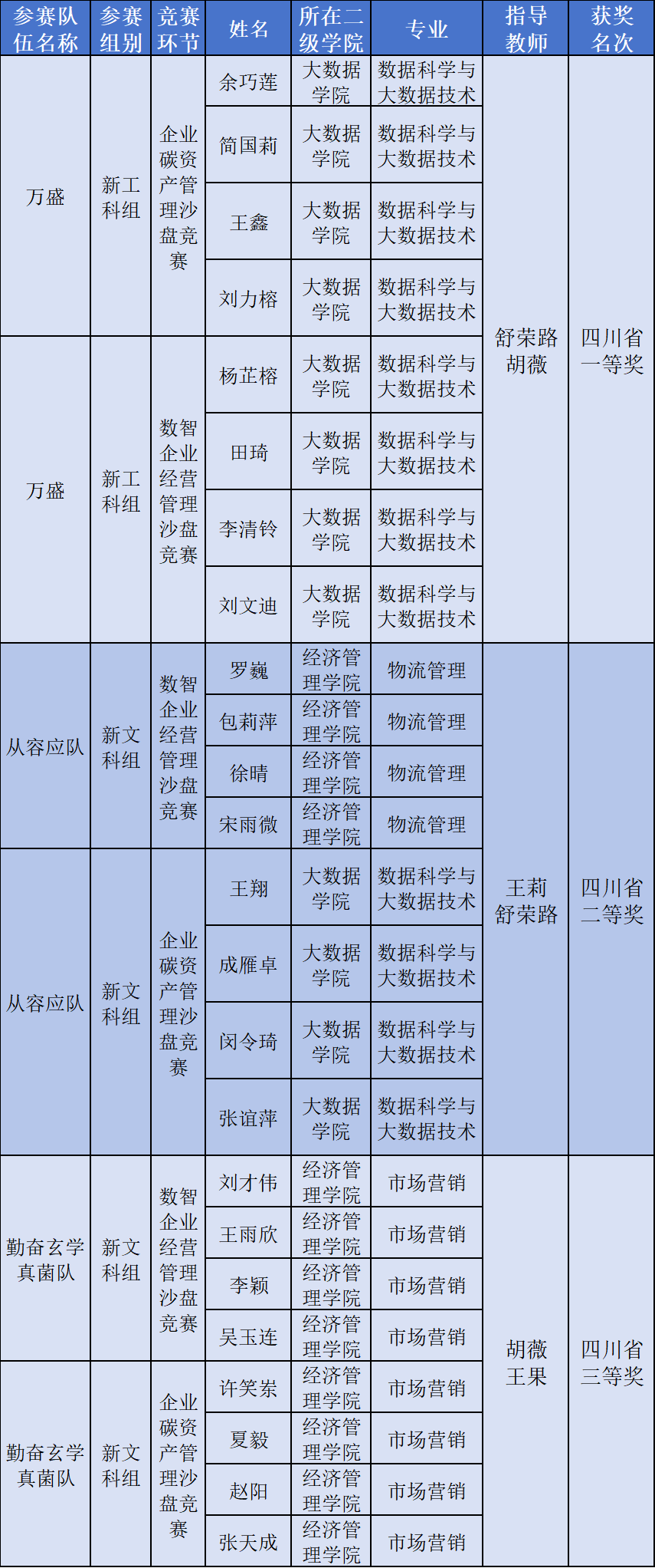 经过一个多月的辛苦练习,同学们从校赛、省级复赛,一路走到省决赛,最终我校大数据学院数据科学与大数据技术专业学生组成的新工科队伍以决赛排名第一的成绩晋级全国总决赛,舒荣路、胡薇被评为优秀指导教师;由经济管理学院物流管理专业、市场营销专业,大数据学院数据科学与大数据技术专业的同学组成的两支新文科队伍喜获二、三等奖。