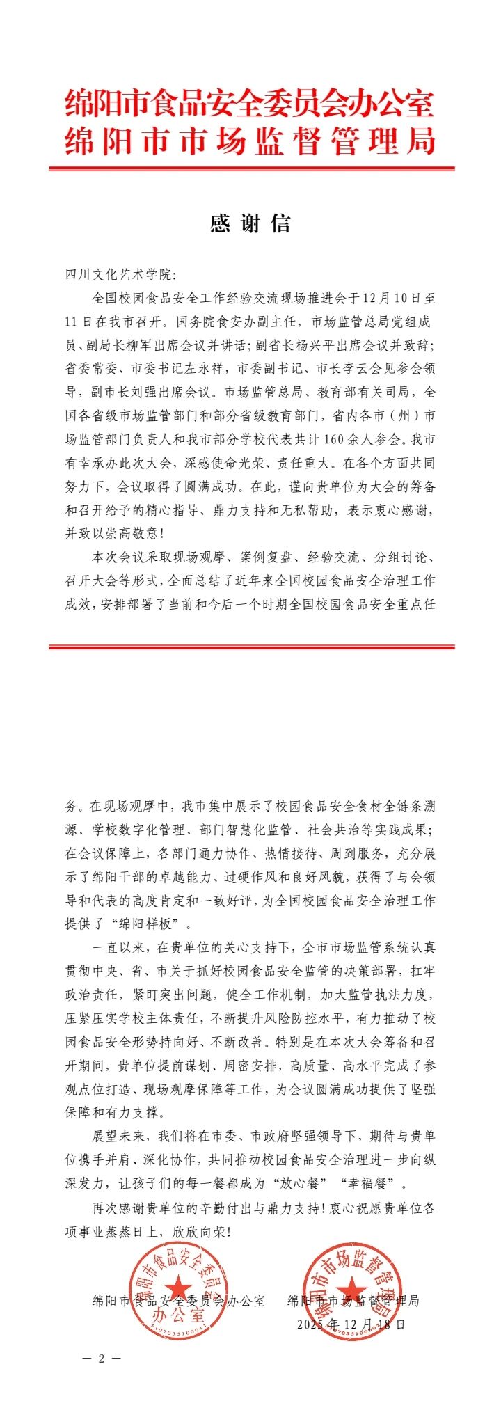 近日,绵阳市食品安全委员会办公室、绵阳市市场监督管理局向四川文化艺术学院发来感谢信,对学校在全国校园食品安全工作经验交流现场推进会期间作出的突出贡献表示衷心感谢与崇高敬意。这封感谢信不仅是对我校食品安全管理工作的高度认可,更是对学校“以生为本、精益求精”服务理念的生动褒奖。