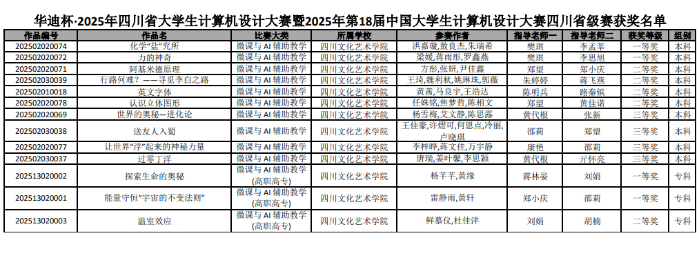 2025年5月17、18日,第18届“华迪杯”中国大学生计算机设计大赛四川省级赛圆满结束。此次比赛是由学校通识教育学院组织,网易人工智能产业学院和数字传媒学院积极参与,刘娟老师担任领队,带领18名教师和39名学生参加了比赛,共斩获一等奖4项、二等奖5项、三等奖4项,其中《化学“盐”究所》《力的神奇》《探索生命的奥秘》《能量守恒“宇宙的不变法则”》4件作品被省赛组委会推荐参加2025年第18届中国大学生计算机设计大赛全国总决赛。