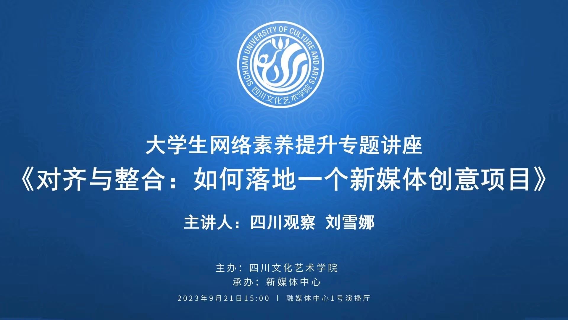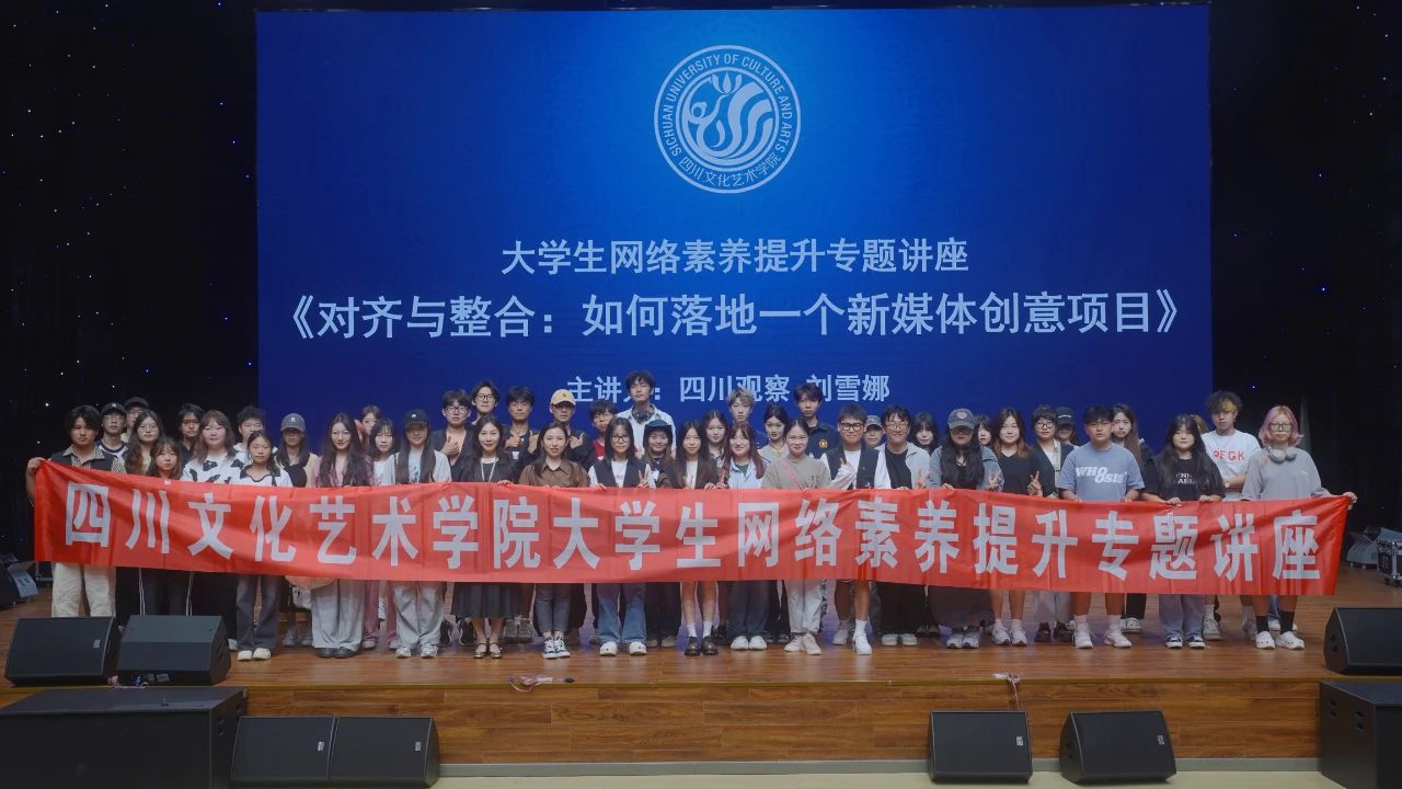 为增强大学生对网络的理解和认识,落实社会对大学生网络道德建设的重视和支持,推动形成良好网络生态,引导大学生进一步弘扬时代新风,共建网络文明,不断提升其安全用网,善于用网,文明上网、提升网络技能素养,9月21日下午3点,由四川文化艺术学院主办,新媒体中心承办的大学生网络素养提升专题讲座《对齐与整合:如何落地一个新媒体创意项目》在梓潼校区融媒体一号演播厅顺利进行。此次讲座特邀四川观察的运营项目负责人刘雪娜老师作主题讲座。新媒体中心学生助理、数字传媒学院、戏剧影视学院、美术设计学院等共计340余名师生共同聆听了讲座。讲座由新媒体中心主任龚静老师主持。