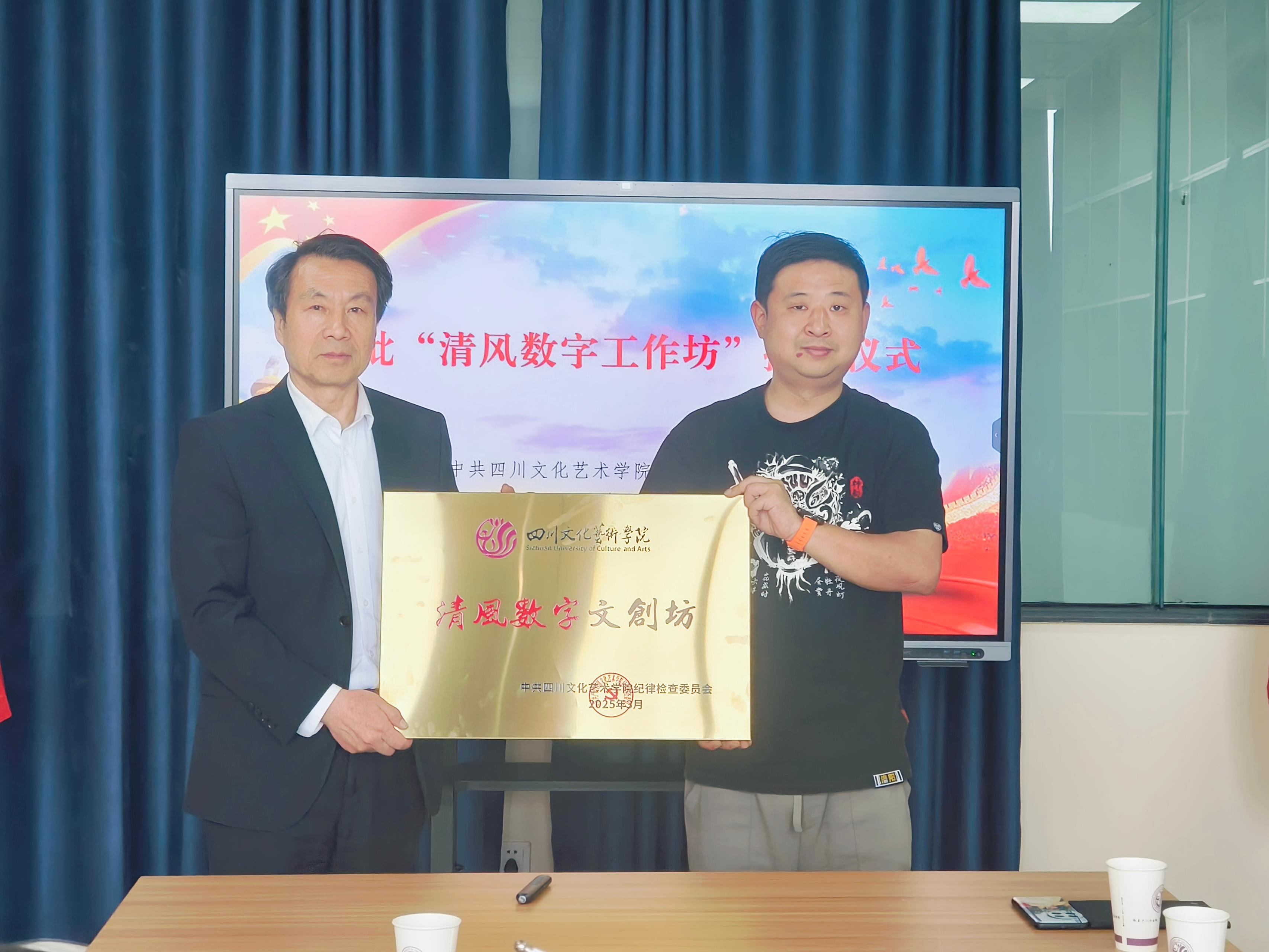 会上,张璇宣读了《中共四川文化艺术学院纪律检查委员会关于建立首批“清风数字工作坊”的通知》,刘立新为美术设计学院授予“创艺先锋工作坊”,为数字传媒学院授予“清风数字文创坊”,为戏剧影视学院授予“戏剧创演工作坊”,为文化旅游学院授予“中华文化工作坊”,为经济管理学院授予“文化创意工作坊”,为网易人工智能产业学院授予“知行·人工智能育梦先锋社”。