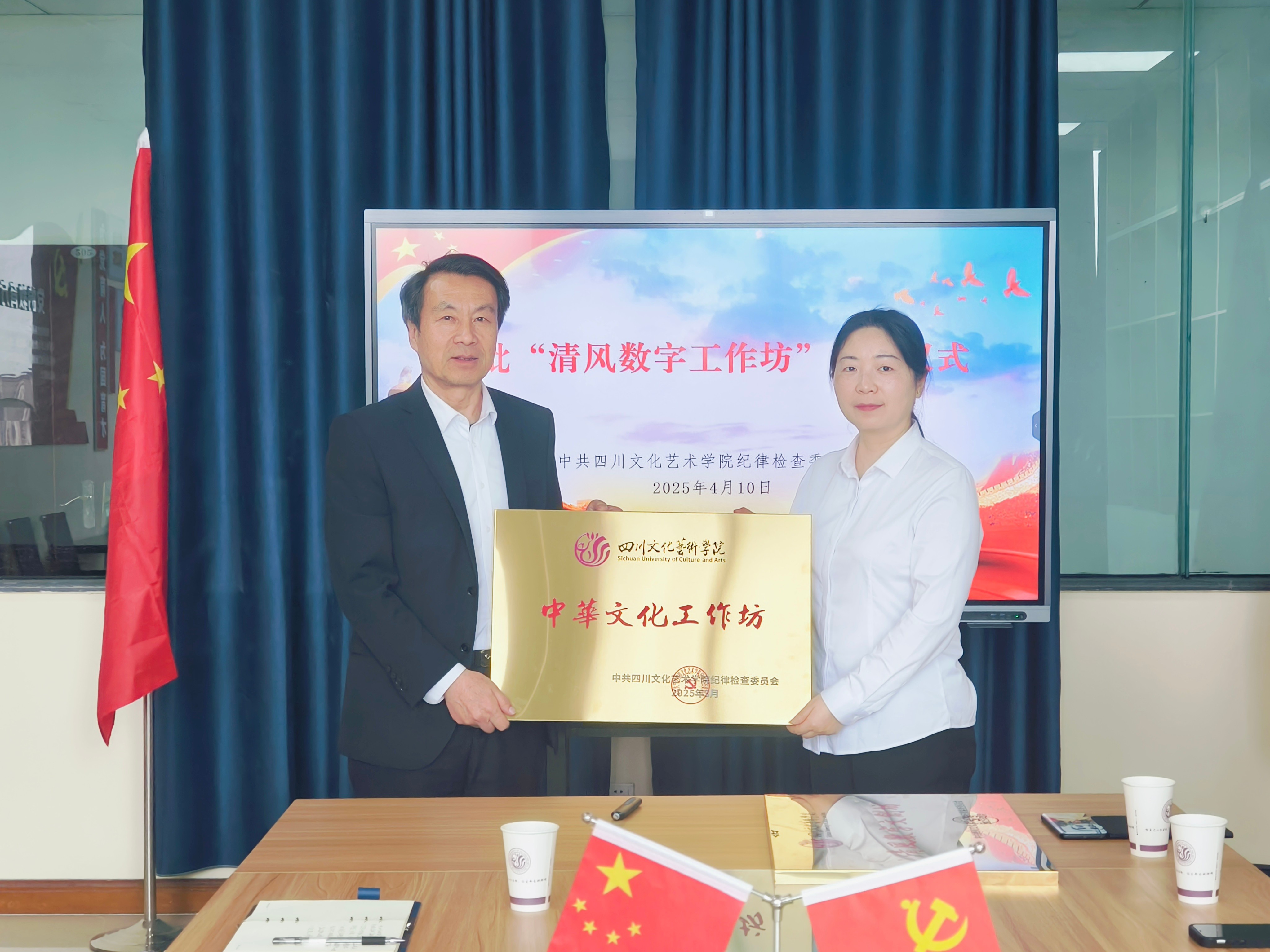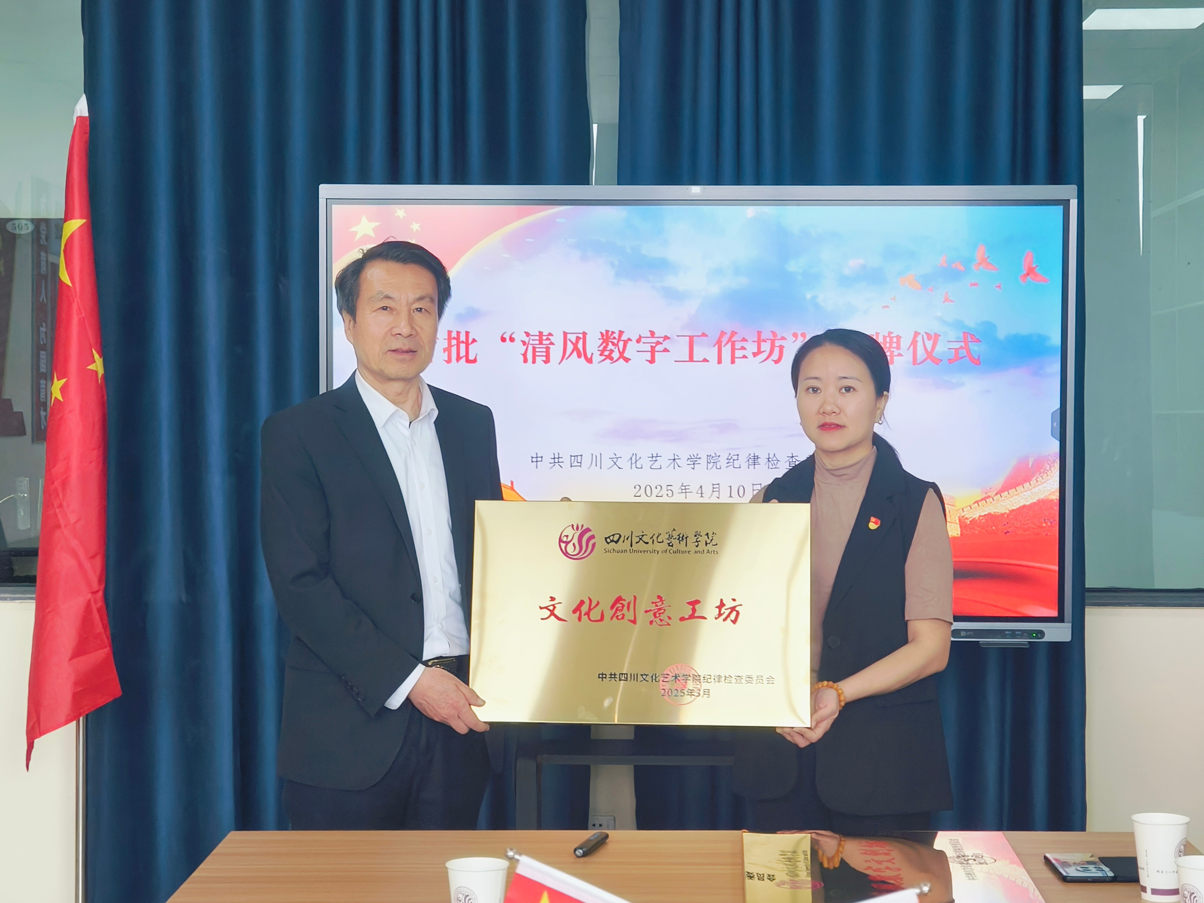 4月10日上午,为深入贯彻党中央关于全面从严治党的战略部署,推动廉洁文化建设与教育教学创新发展,学校纪委在绵阳校区王蒙文学艺术馆五楼会议室举办首批“清风数字工作坊”授牌仪式,学校党委副书记、纪委书记刘立新,纪委副书记、人民武装部部长、安全保卫部部长严成,纪委委员、校长办公室副主任张璇和首批被授予“清风数字工作坊”的工作坊负责人参加授牌仪式。授牌仪式由严成主持。