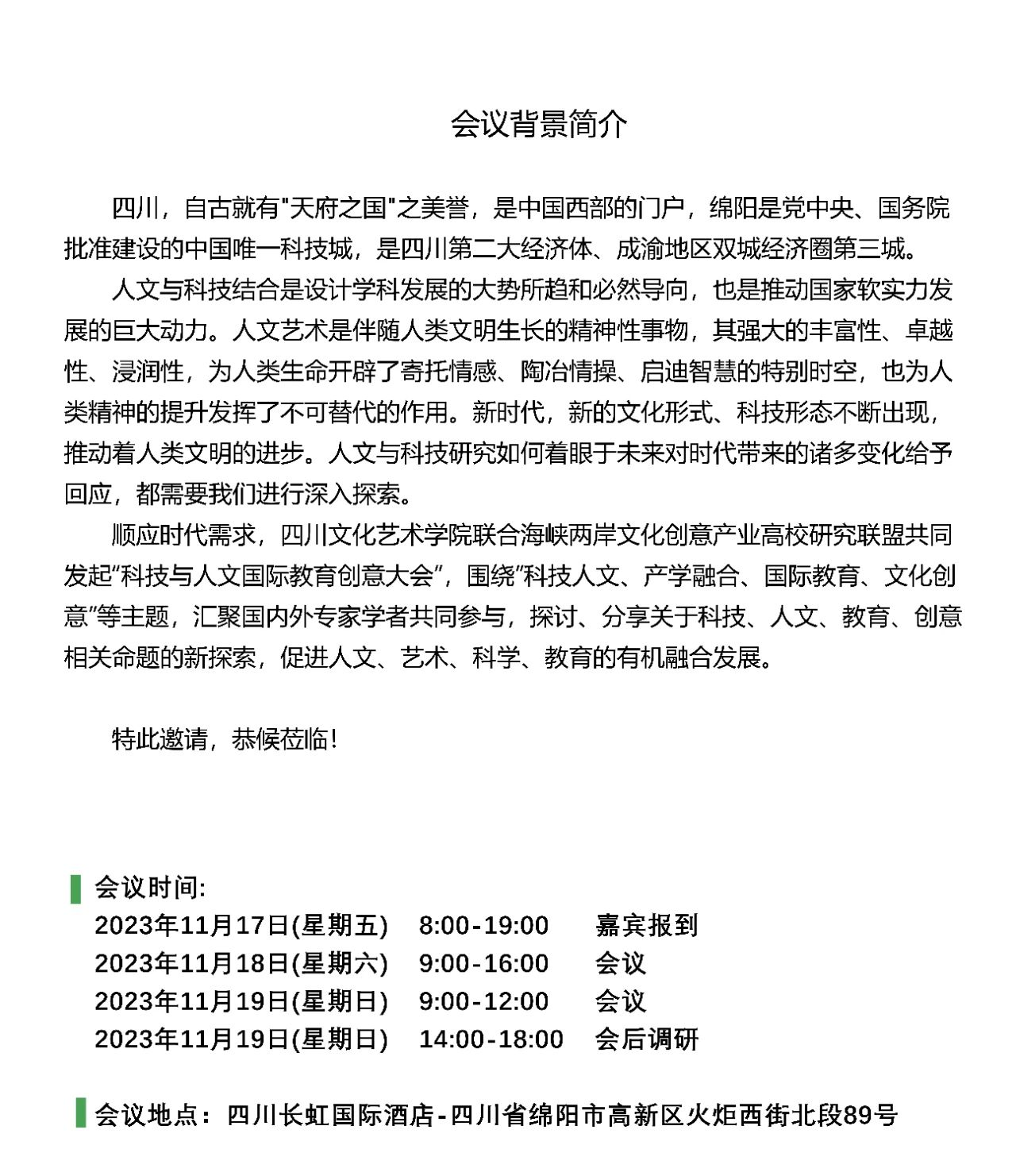因应时代需求,四川文化艺术学院联合海峡两岸文化创意产业高校研究联盟共同发起“科技与人文国际创意大会”,紧密围绕”科技人文、产学融合、国际教育、文化创意”等主题,邀请来自国内外专家学者共同参与,探讨、分享关于科技、人文、教育、创意相关命题的新探索,促进人文、艺术、科学、教育的有机融合发展。据悉,大会将于2023年11月17日至2023年11月20日在绵召开。
