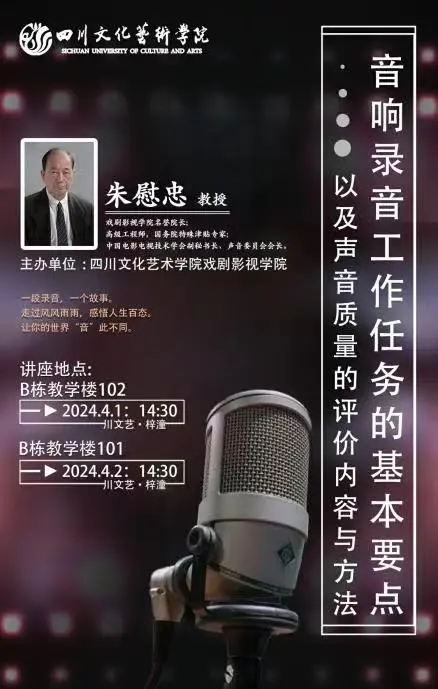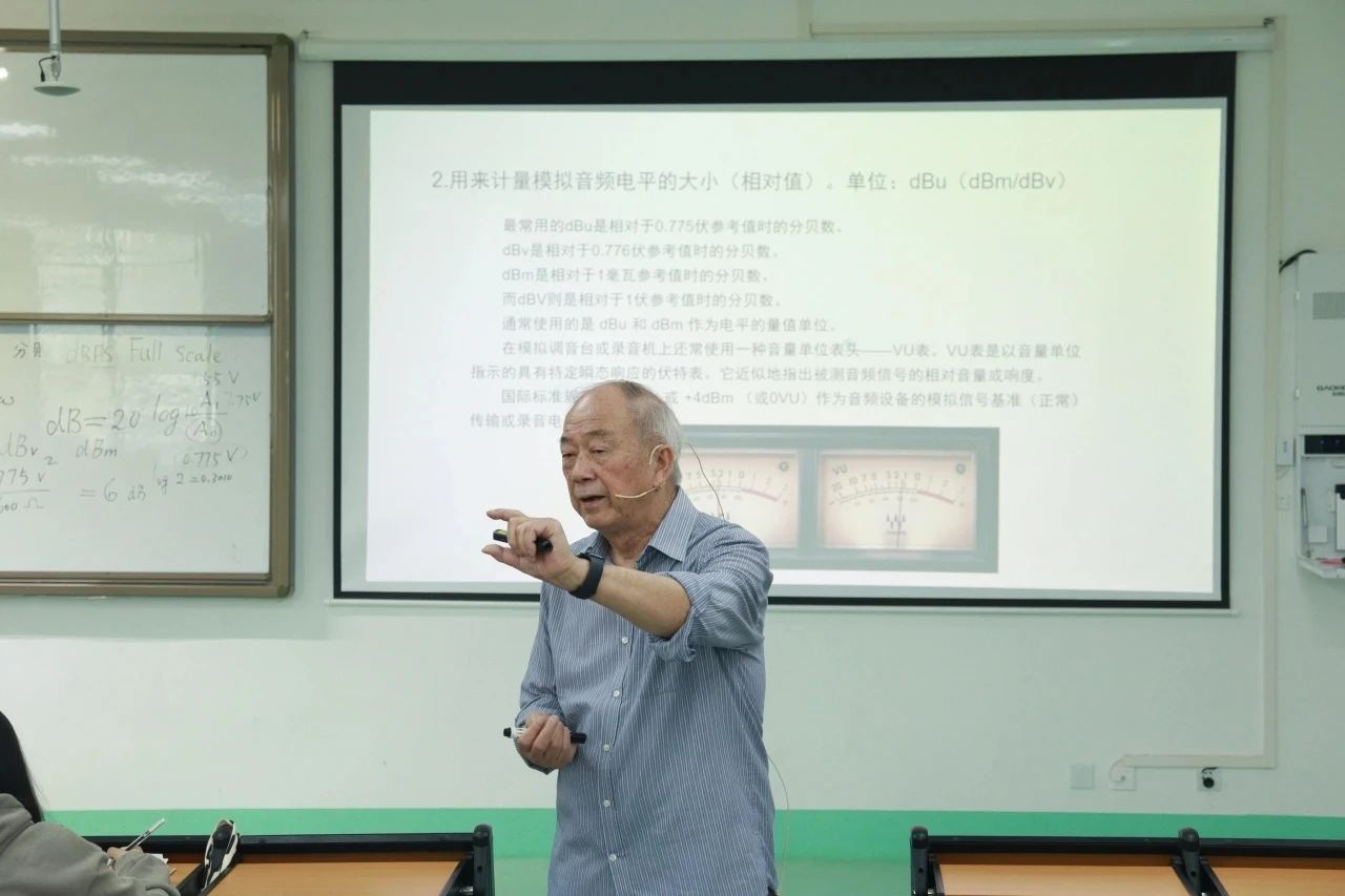 讲座内容丰富,涵盖了音响录音设备的基本原理和操作技巧。4月1日的讲座内容主要围绕音响录音工作任务的基本要点展开,朱慰忠教授从四个角度进行详细讲解:声音的产生、声波的基本特征、人耳对声音感觉的三要素以及心理声学。而4月2日的讲座则专注于声音质量的评价内容与方法,重点介绍了分贝(decibel,简称dB)的定义和用法以及音频设备器材的主要电声性能指标。