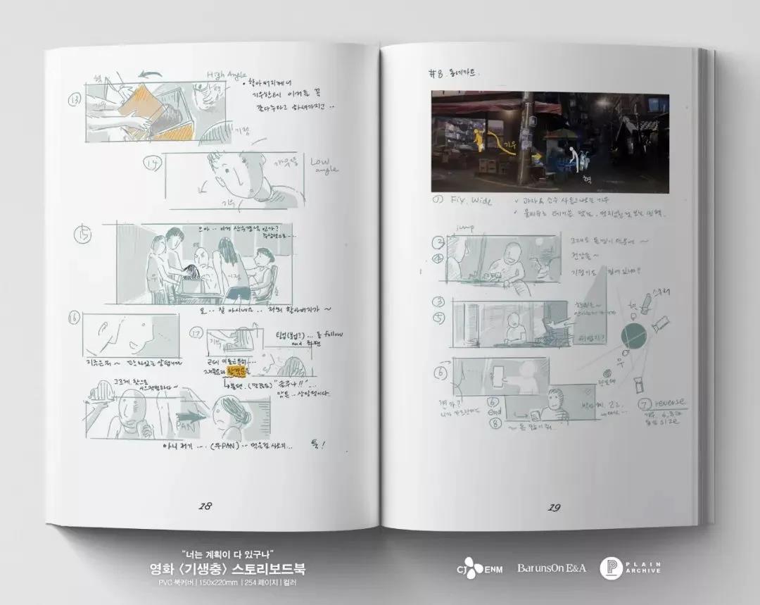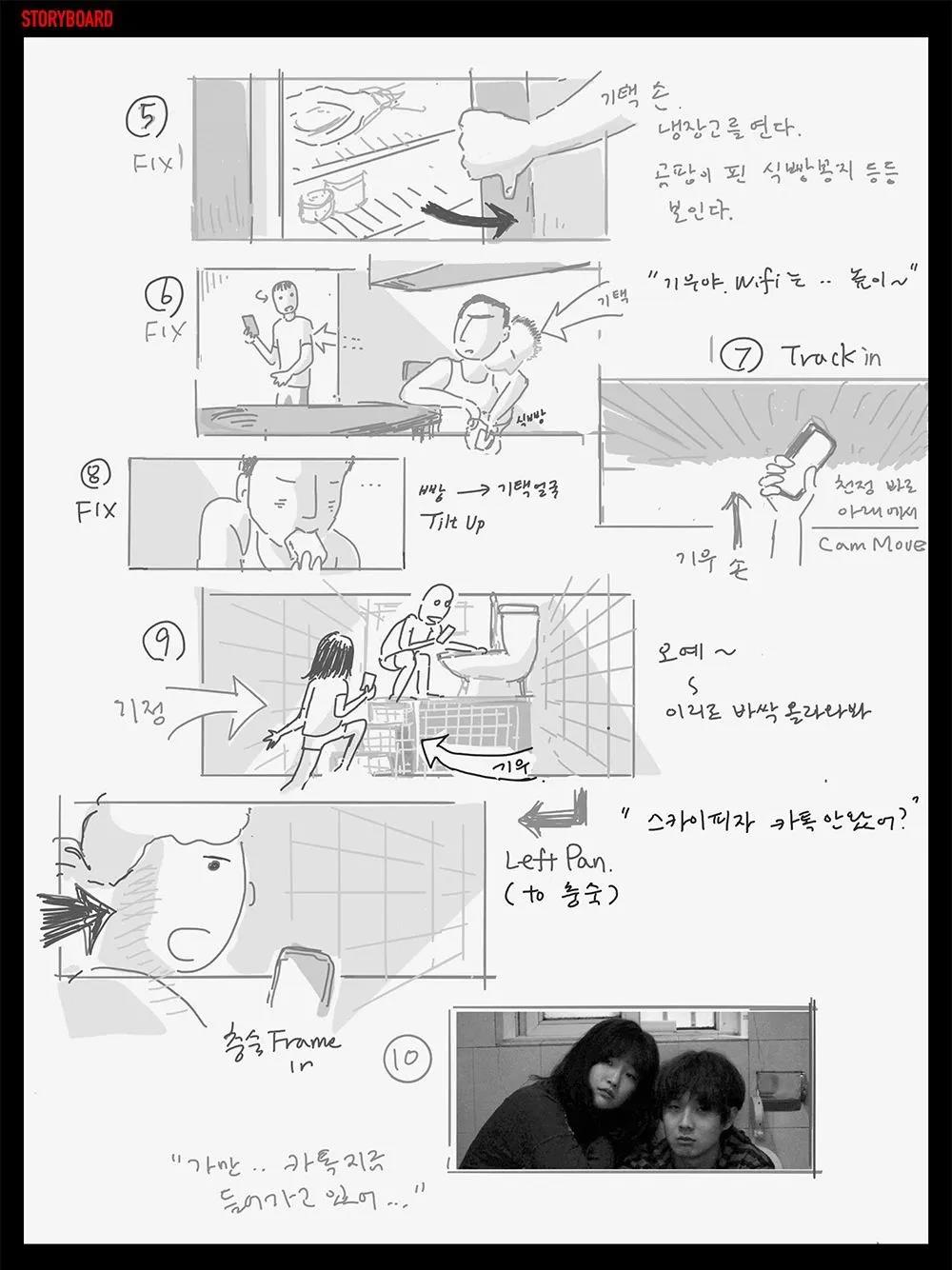 同时,社会学出身的他在工作中始终保持着严谨的态度。他在每一部作品的创作前期都会搜集大量的参考资料,精心构思和绘画每一个电影场景的草图,对一个动作、一句台词都有着细致入微地设计和安排。他绘制的手稿与后期的电影拍摄几乎可以无缝对接,属于典型的作者型导演。而这些「细节控」的表现和他对电影的深度表达方式,也使得奉俊昊被影迷们称为「电影社会学家」。