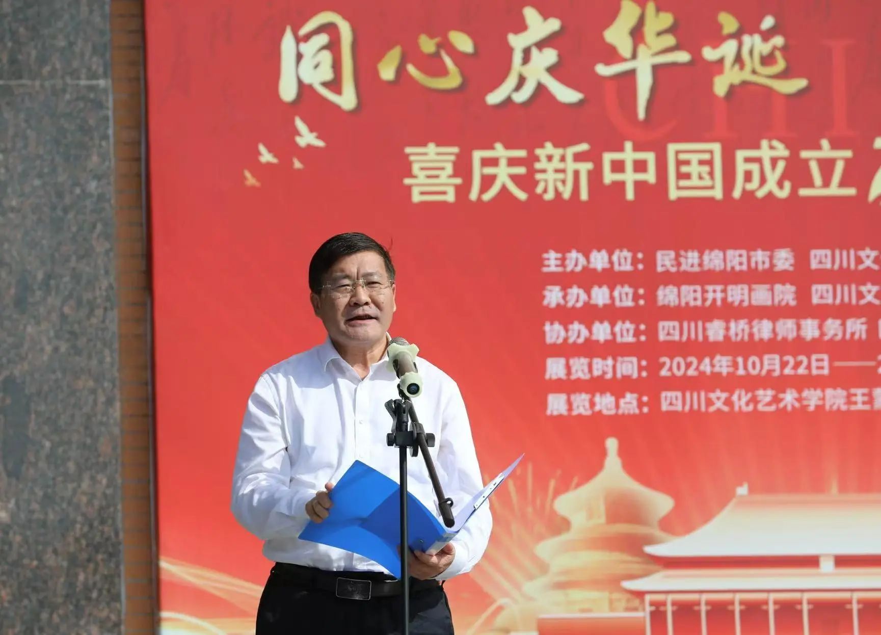 为喜庆新中国成立75周年,10月22日上午,由我校和民进绵阳市委会联合主办的喜庆新中国成立75周年书画展开幕式在我校绵阳校区王蒙文学艺术馆开幕。民进四川省委会专职副主委张宏,绵阳市人大常委会副主任、民进绵阳市委会主委李京平,中共绵阳市委统战部副部长陈龙;我校党委书记、省政府督导专员左冬梅,党委副书记、纪委书记刘立新,党委宣传部部长、统战部部长廖江,受邀参加活动的有关领导和来宾,民进绵阳市委会有关会员和我校有关院部负责人及师生代表参加开幕式。开幕式由绵阳开明画院秘书长杨盛主持。